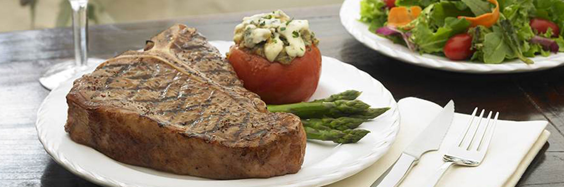 T-bone steaks infused with crushed garlic, served alongside tomatoes topped with creamy Roquefort cheese.